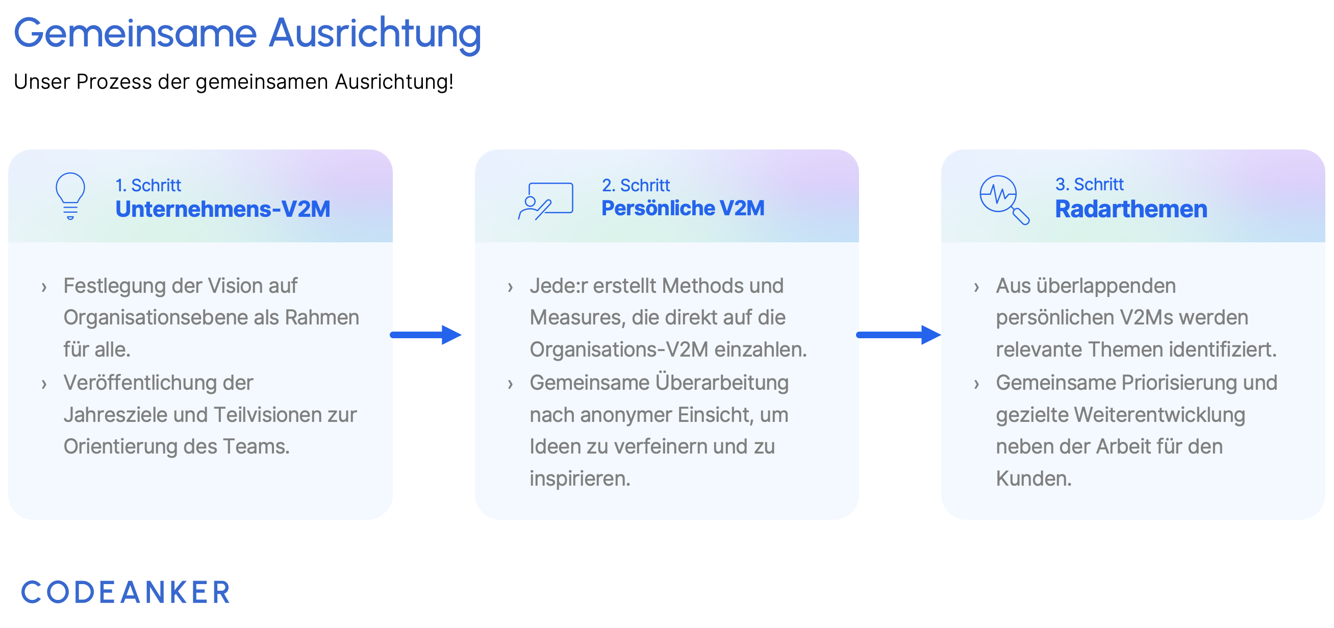 So auch die Idee für uns. Wir schaffen ein gemeinsames Kommunikationsinstrument: Jede:r definiert persönliche V2MOMs, die mit den übergeordneten Zielen von CODEANKER verknüpft sind. So wird deutlich, wie individuelle Beiträge und Teamziele ineinandergreifen.